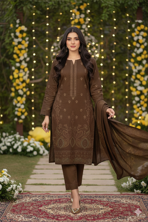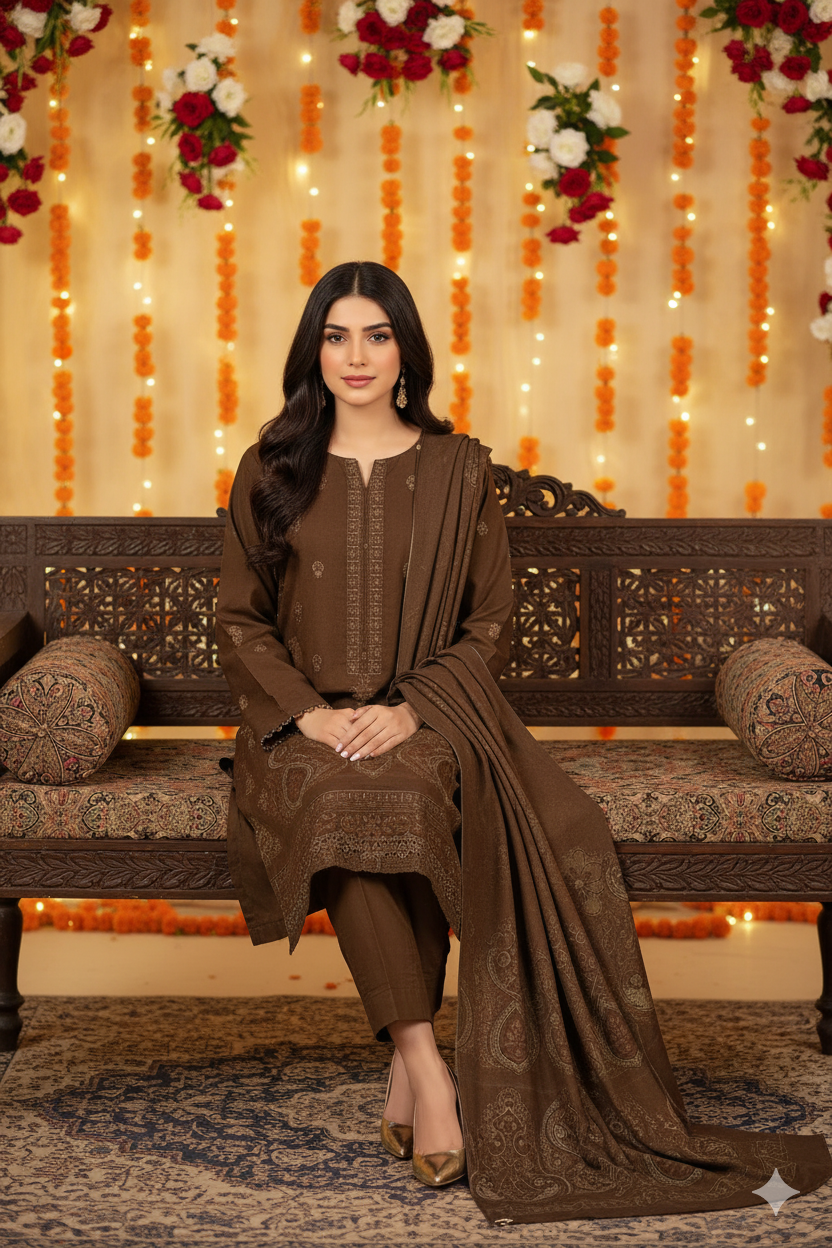 Beautiful deep chocolate brown 3-piece embroidered suit featuring intricate detailing on premium Vintex Peach fabric. Soft, luxurious texture ideal for elegant winter wear with a classy and comfortable fit.